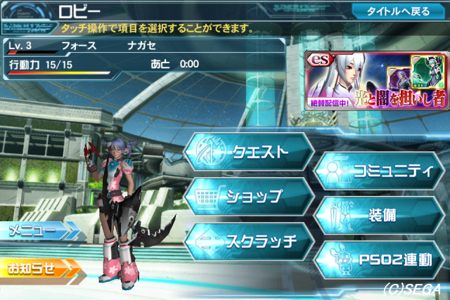 2014/05/15 Category : PSO2 立て続け スマホ向けのPSO2拡張ソフト、PSO2esがiOSでも配信開始されてた。 早速データを同期してみた。 ゲーム内容はiOSではお馴染みインフィニティブレード的操作に、ソーシャルカードゲームのような要素を足した感じ。 攻撃ではジャストアタックの要素もあるのでそこそこアクション的ではある。 esと本編は連動していて、ここで手に入れたものや経験値をPSO2に持っていくことも可能。 マグ育成もできるので、育てている人には少し役立つアプリか。 しかしesの内容そのものはよくあるソーシャルゲームなので、果たしてPSO2プレイヤーとしてはどう向き合えばいいのかよく分からんというのが正直なところ。 あと4sだからかなんなのか、クエストロード中によくアプリが落ちる。 そして落ちると必要スタミナを消費してるので、スタミナを全部使い切るようなクエストだとちょっとどうなんだという感じ。 esやるにあたって最初にキャラデータを連動して始めたんですが... フィールド降りると別人なんだけど。 酷いバグなので早く修正するように。 なんか3GBのパッチあてるとどうのこうのと書いてあったけど、それでキャラの再現度があがるんだろうか? さすがにアホらしい容量なのでやらんけど。 しかしこの数日の間にモンハンやらPSO2やらFFアギトやらと、大手のビッグタイトルが立て続けにiOSで配信されて賑やか。 まあその内容はともかく。 ------------------------------------------------------