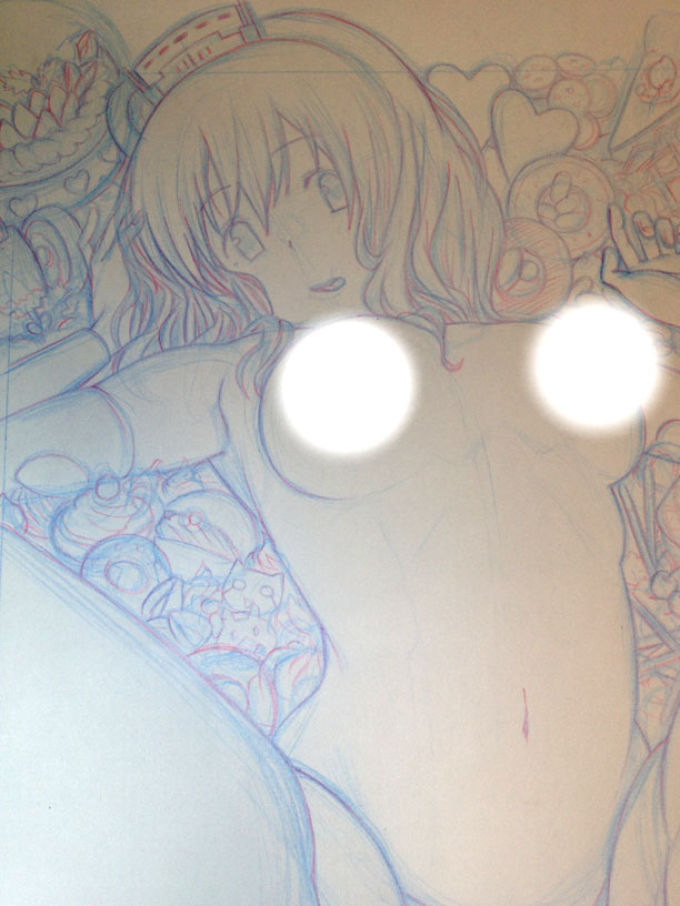で、背景のお菓子群をペン入れしてたんですが、途中で「めんどい」となりまして、厚塗りで対応することにしました。