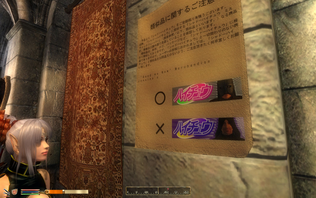 2009/11/05 Category : oblivion ma-sa-ka なんかここ最近ものすんごーく、シャドウハイチュウって検索が多いけど・・・ もしかして、コレを探していらっしゃるのでしょうか?! (言葉の意味だったら過去記事参照して) コレだったら普通に帝都商業地区のジェシーンのお店に売ってますよ? 一回、探しに行ってみたらどうですかね? 盗賊ギルド的にそれはどうなんだと言わざるを得ないg・・・ ちなみに壁には、類似品への注意喚起の張り紙が。 味とパッケージが違う非正規品が出回っている模様。 前世の記憶だろうか・・・コイツの顔には見覚えがある。 確かシャドウハイチュウには何の関係も無かった気がするが・・・ 裏で流通しているものっぽいので、探すのはそう容易くは無いだろう。 冒険の合間に探してみては如何か。 さて、店に行っても見当たらなかった人は、英語に書き換えて検索したら良いと思う。 製作したModderさんに感謝。