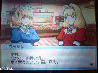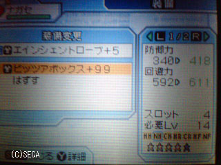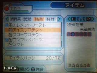 2009/01/09 Category : PSZ とりのあえず アイスプロテクトが出ネー(゚д゚) 何やら合間合間にDSの電源をぽちってしまいます、恐るべし雪原周回。 これもハードの合体ロボが強すぎるからだ!ヾ(´д`)ノ いつスーパーハードに行けるやら、2NDが育ってしまいましt と、いつまでも年始の挨拶を一番上に置いておくのもあれなので、無理繰りPSZEROの話をしてお茶を濁す。 PS0でおおっと思った部分、今作は音楽に非常に凝ってますね。 PSUでエネミーが出た時音楽が変わらないって言われてたので、やれるだけやってみましたって感じ。 通常戦闘時のシームレス変化はもちろん、レアエネミーやブーストエネミーが出た時には音楽のピッチが上がるし、同じステージの音楽でも何パターンか用意されているさり気なさが丁寧。 ラストダンジョン後半部の戦闘はテンション上がる・・・レアエネミーなんか出たら最高(´∀`) あとこんな感じで突然マップにレアなフロアが出現するのも、単調になる探索に華を添える良い演出。 もちろんレアフロアでしか出ないものもあるから、狙って探しにいくと地獄。 PSOのパレットとPSUのPAの調和も取れているし、PSOの正統進化は伊達じゃない。 相変わらずただウザイだけの敵が一部いるのが気になるが(゚д゚) しかしこれをベースに据え置きで集大成を出すとすれば、正直それ以上何か望む進化があるのかなあとも思ってしまうなぁ。 そんな辞め時を探ってしまいたくなるほど、次には期待。 ナウラ3姉妹のケーキ屋発見記念。 何やら作為的な並びになってしまったが他意は無い、次はピザ屋だ。 最後にWifiフリーは定型文だけで寂しいって書いたけど、ちょっと撤回。 ロビーアクション織り交ぜながらやってたら、結構乗ってくる人が多い! 此間5分くらいお疲れ様連呼しながら、だれも落ちずにロビアクダンスし続けるという誰が先に根負けするかのプチ我慢大会が開かれてしまいました。 意外と妙な意思疎通ができるもんです、おためしあれ。